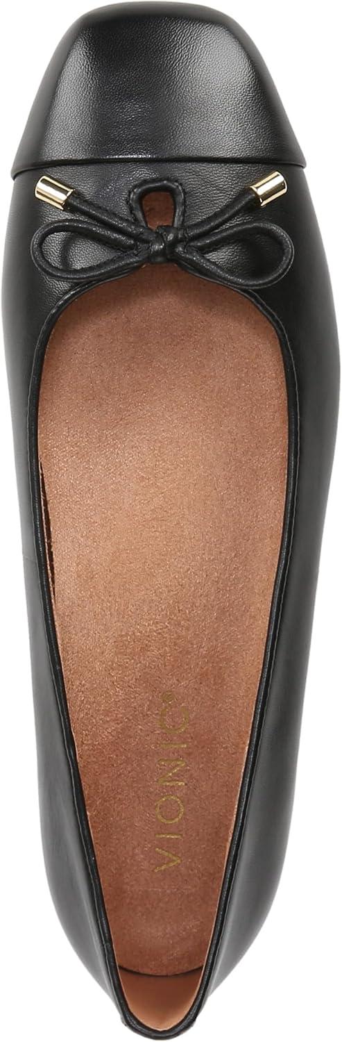 A contemporary ballet silhouette makes Klara a top choice for classic daily wear with its modern square toe, bow detail, and removable supportive orthotic. Designed with exclusive alignment technology to balance the whole you. Premium upper materials. Durable synthetic outsole designed to withstand everyday wear. Removable lightweight EVA insert. Built-in VIO MOTION Technology footbed featuring contoured arch support, with shock-absorbing cushioning, deep heel cup to provide stability, and forefoot flexibility. Vionic flats include full underfoot contact to reduce pressure with every step. Helps alleviate heel pain caused by plantar fasciitis or achilles tendonitis. It's recommended to wear your new pair for a few hours to allow your feet to adapt to the new support. .75 inch(es) heel height. Imported.