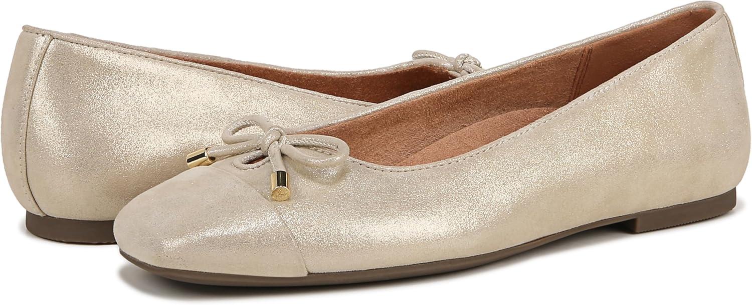 A contemporary ballet silhouette makes Klara a top choice for classic daily wear with its modern square toe, bow detail, and removable supportive orthotic. Designed with exclusive alignment technology to balance the whole you. Premium upper materials. Durable synthetic outsole designed to withstand everyday wear. Removable lightweight EVA insert. Built-in VIO MOTION Technology footbed featuring contoured arch support, with shock-absorbing cushioning, deep heel cup to provide stability, and forefoot flexibility. Vionic flats include full underfoot contact to reduce pressure with every step. Helps alleviate heel pain caused by plantar fasciitis or achilles tendonitis. It's recommended to wear your new pair for a few hours to allow your feet to adapt to the new support. .75 inch(es) heel height. Imported.